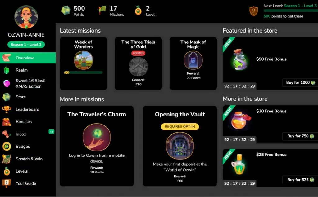 For every mission you complete in the World of Ozwin Journey, you will earn points that can be used to 'buy' bonuses from the virtual store. You can buy free spins, free chips, and deposit-based bonuses and you have 7 days to redeem them. If you forget to redeem the bonus, or if it expires, you will not get a refund so make sure you use your bonus as soon as possible after 'buying' it. World of Ozwin is a virtual world filled with missions and levels to conquer. A mission can be to visit a specific area of the casino, complete a set number of spins, or win money on a pokie. To join, click 'World of Ozwin' in the hamburger menu when logged in to your Ozwin account. Select an avatar and start playing.